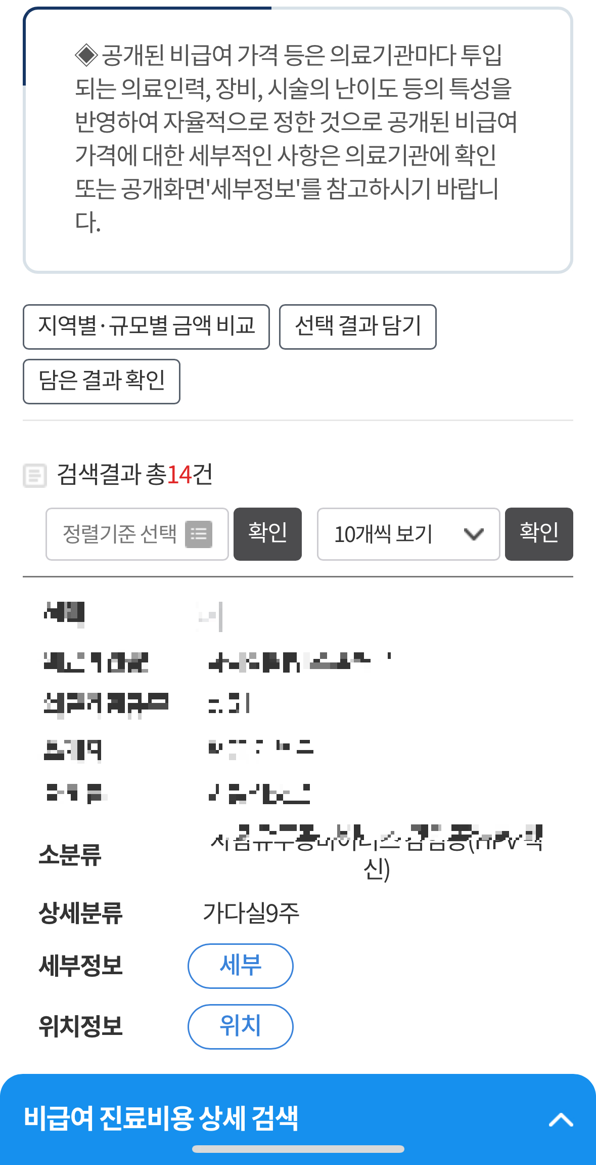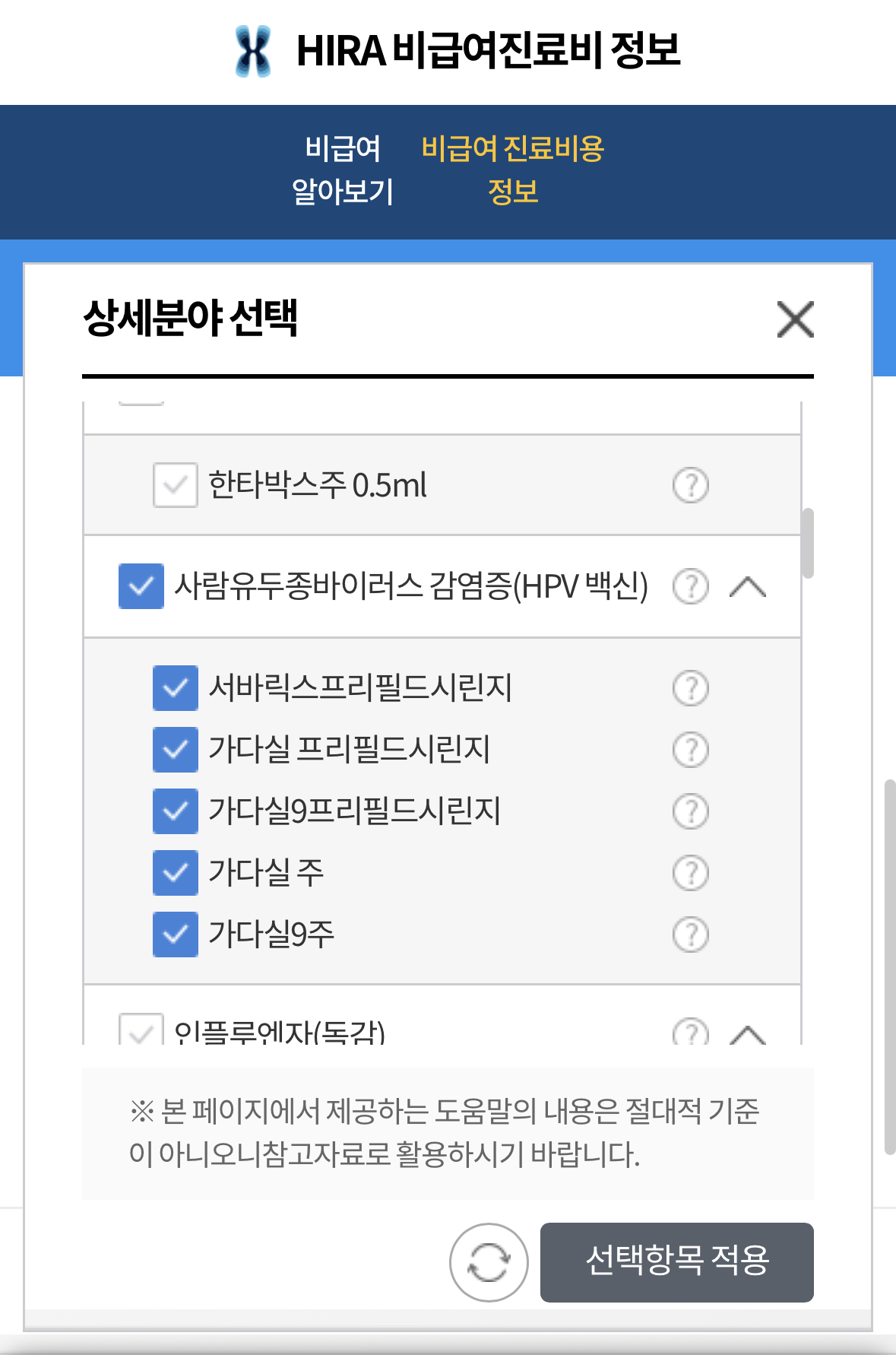 4. 왼쪽 비급여 진료비용 상세검색을 진행한다. 해당지역과 의료기관 규모, 하단에서 예방접종료 클릭 후 '사람유두종바이러스 감염증(HPV백신)'을 선택한다. 선택 한 후에 하단에 '선택항목 적용'을 클릭한 다음 다시 왼쪽 하단에서 '선택항목 검색'을 클릭한다.