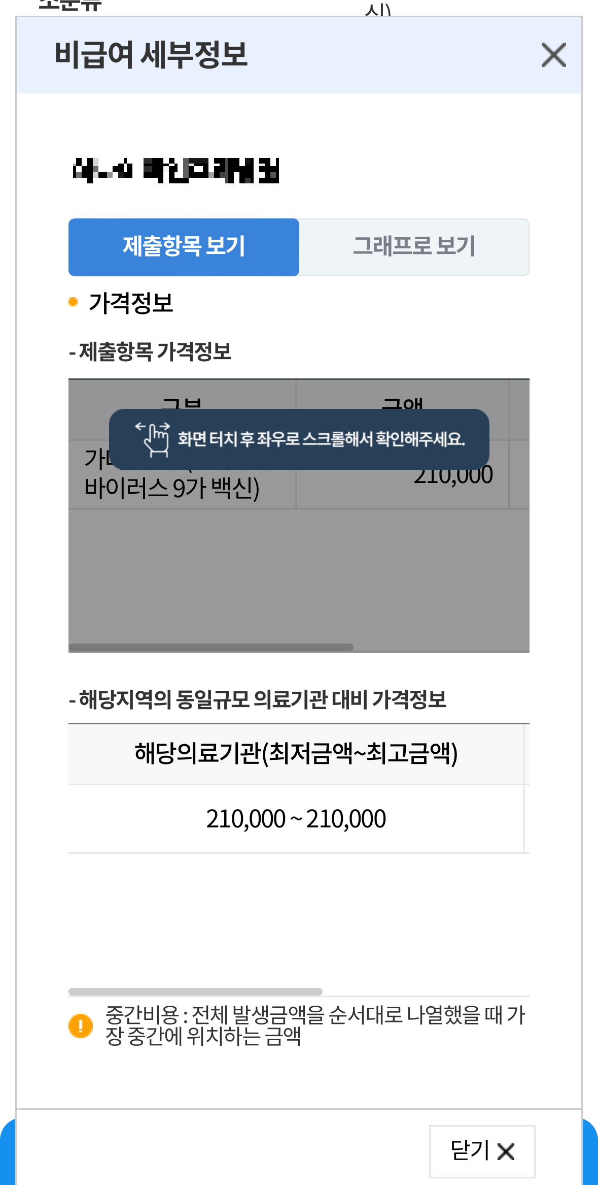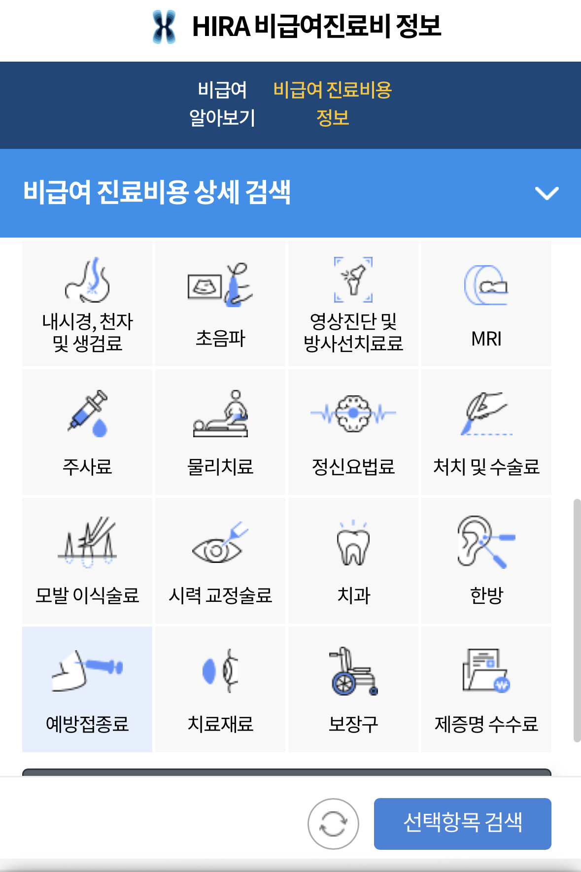 4. 확인하려는 비급여 진료비 항목인 '예방접종료'를 선택 후