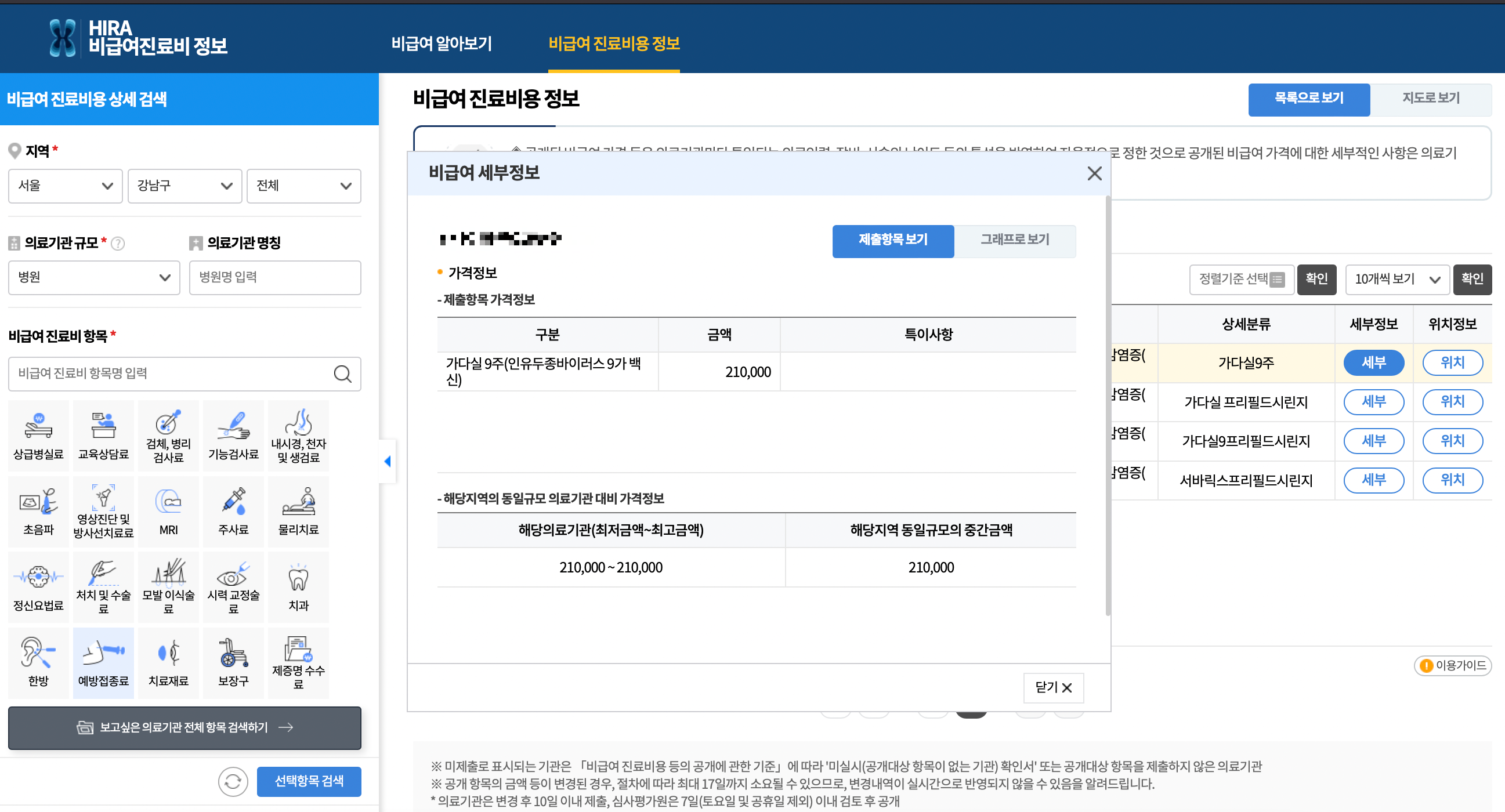 5. '세부정보'를 클릭하면 해당 의료기관의 제출항목 가격정보와 해당지역의 동일규모 의료기관 대비 가격정보가 함께 표시되어 가격을 비교하는데 아주 큰 도움이 된다. 목록으로 볼 수도 있고 지도로 볼 수도 있다.