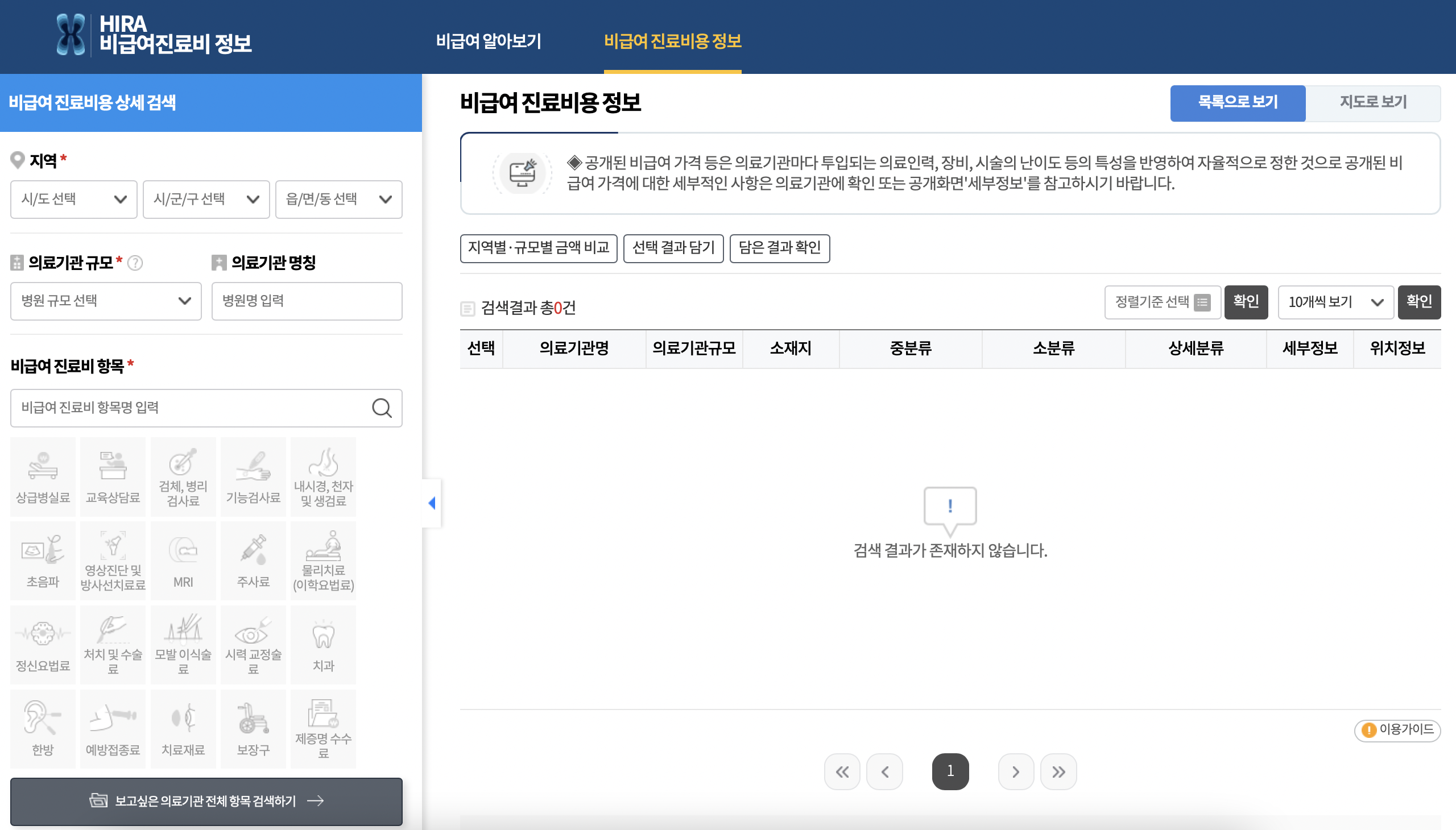 6. '선택항목 적용' 선택 후 '선택항목 검색' 선택하면 아래와 같이 '비급여 진료비용 정보'가 목록으로 확인된다. 지도로 보기도 가능