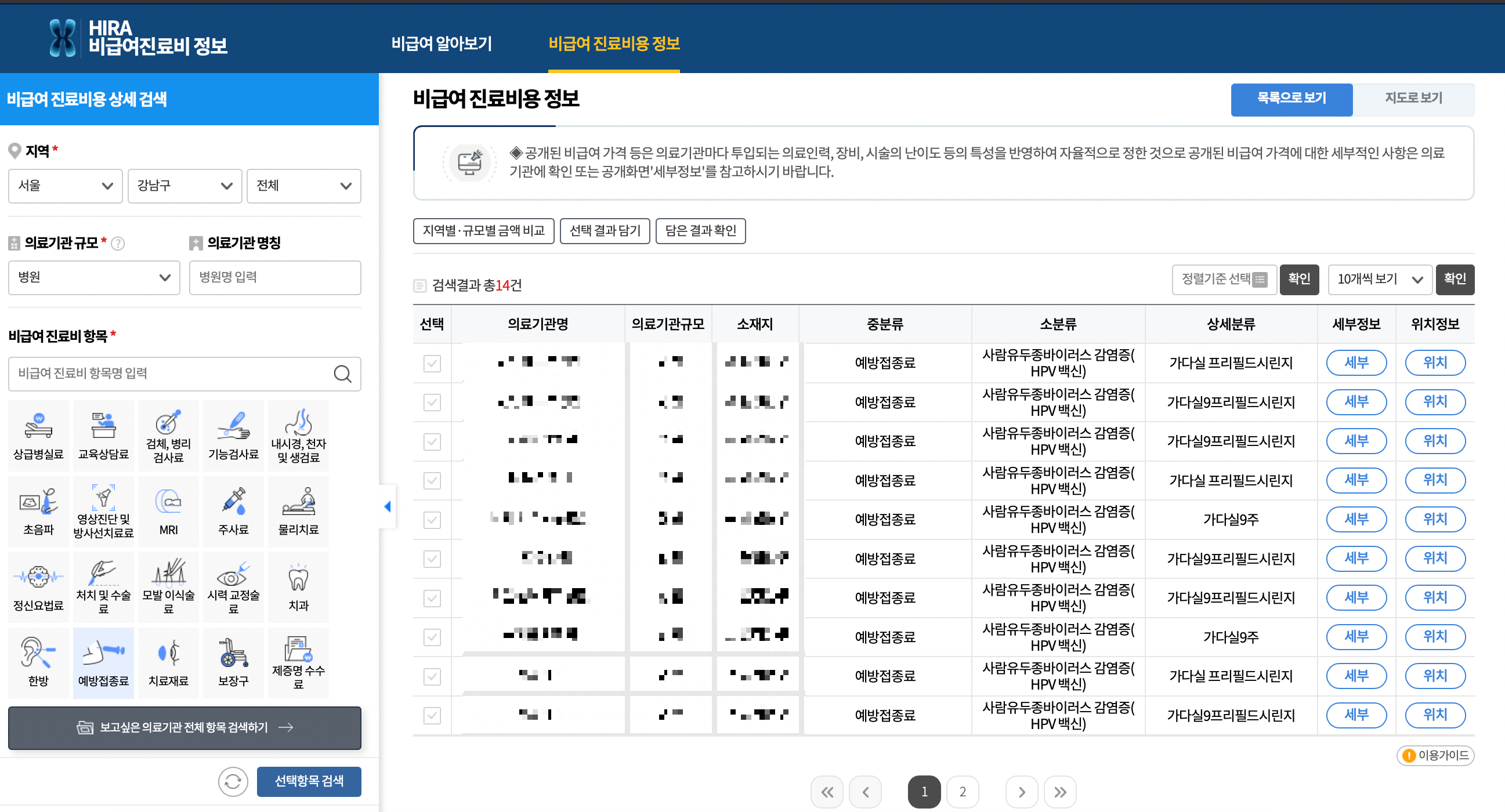 비용이 다양한 만큼 거주지 주변에서 가장 저렴한 가격으로 백신을 맞을 수 있는 곳을 알아보던 중 심평원(건강보험심사평가원)을 접속하면 비용 비교가 가능하다는 정보를 알게 되었다. PC와 모바일 두 가지 버전 모두 확인해 보았다. 건강심사평가원 홈페이지를 이용하면 내가 원하는 지역의 최저가 가다실9의 의료기관을 찾을 수 있다.