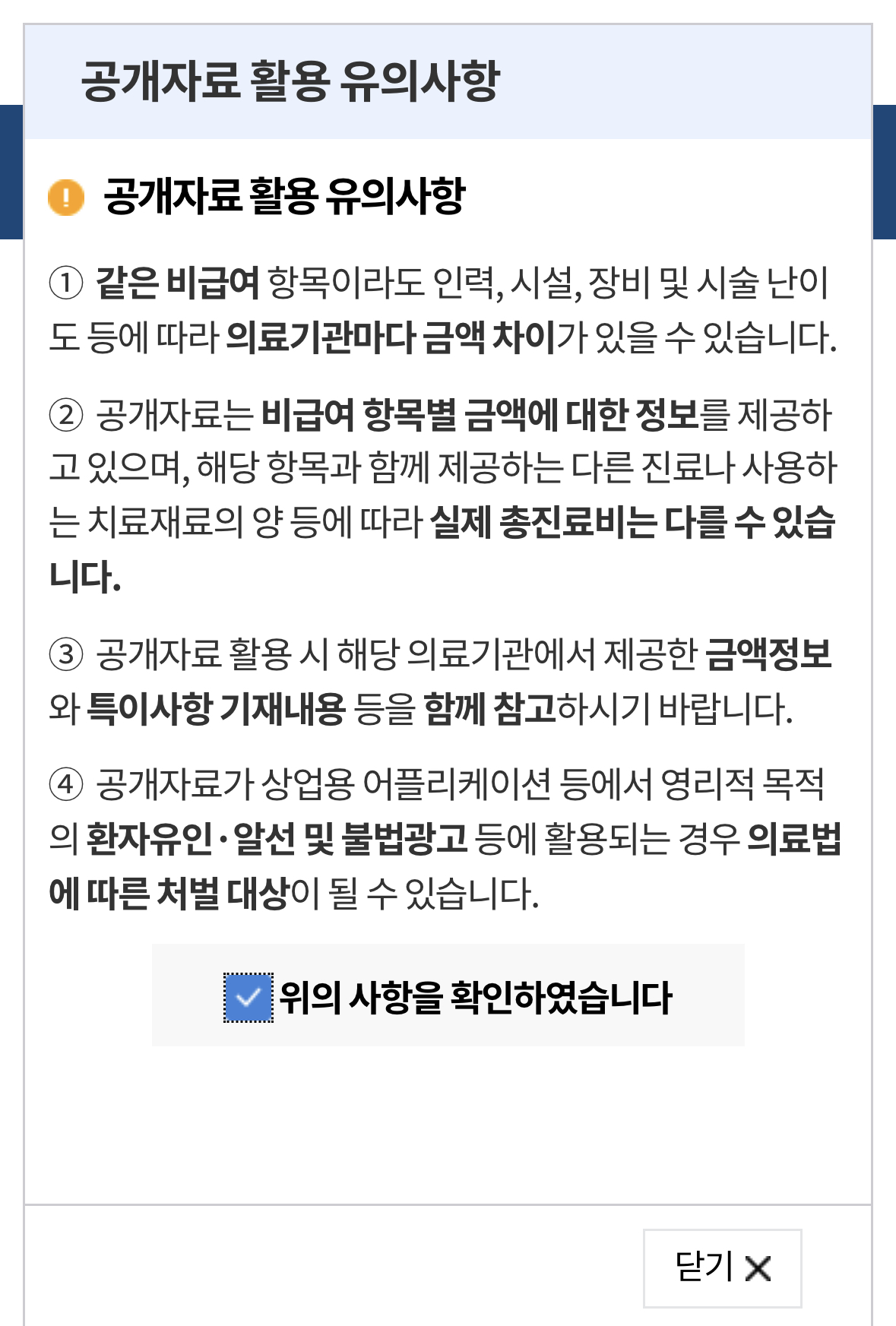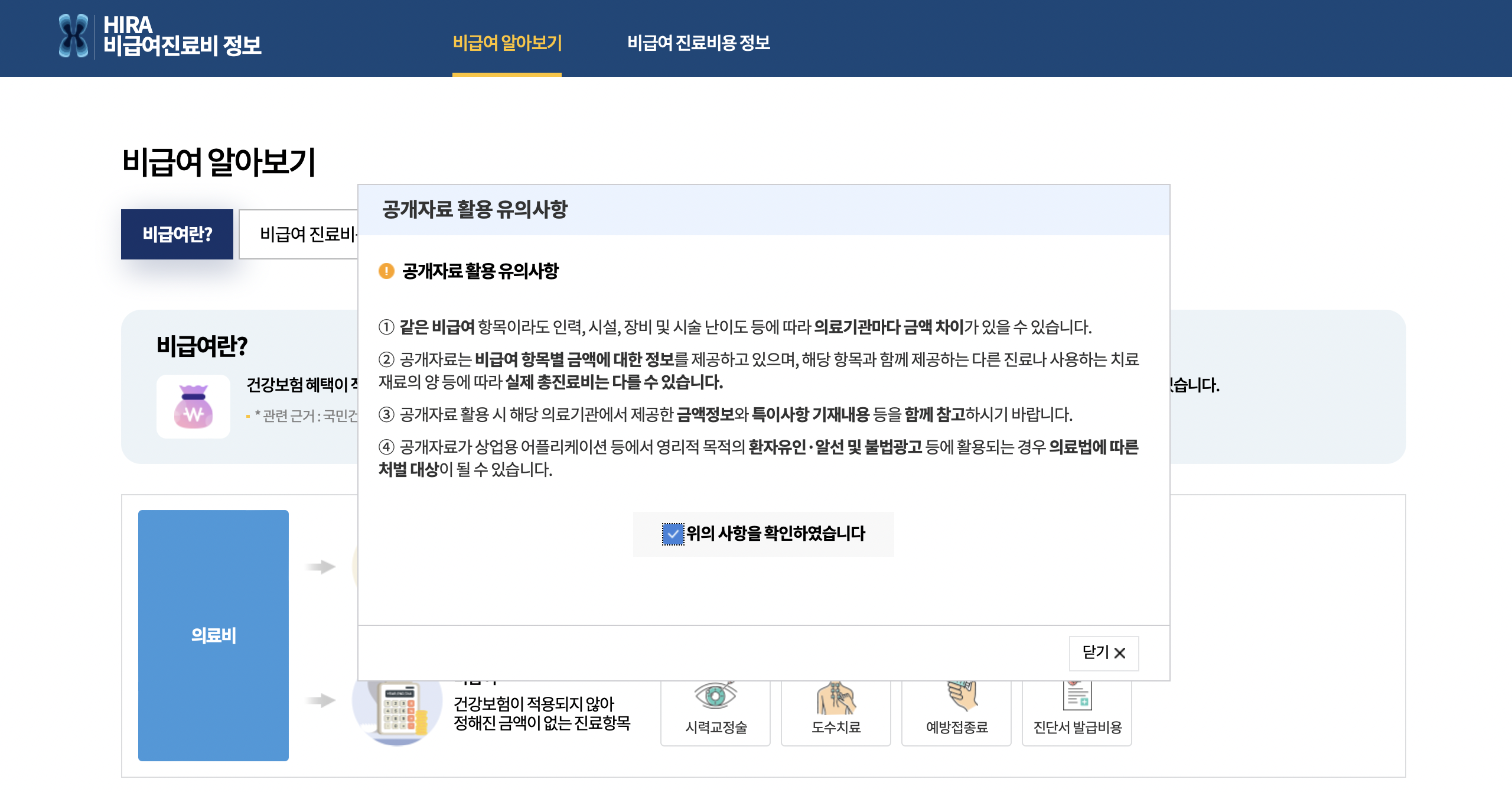 2. 왼쪽에서 두 번째 '비급여 진료비 정보'를 클릭 후 '위의 사항을 확인하였습니다' 체크한다.