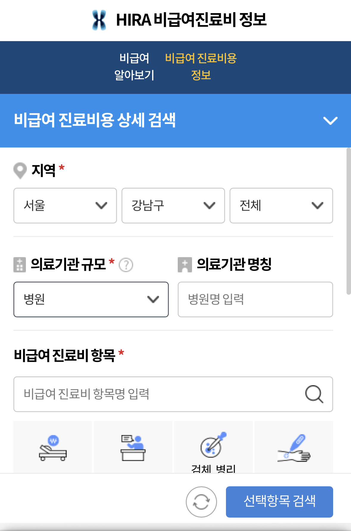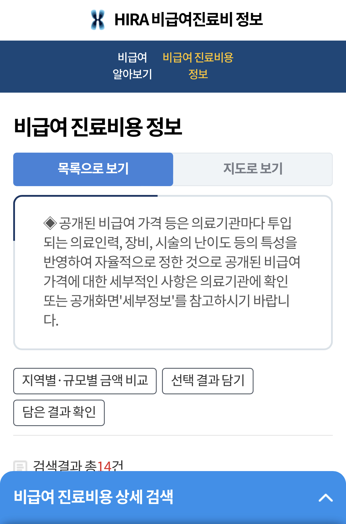 3. 상단의 '비급여 진료비용 정보' 클릭하여 원하는 지역 및 의료기관 규모를 선택한다.