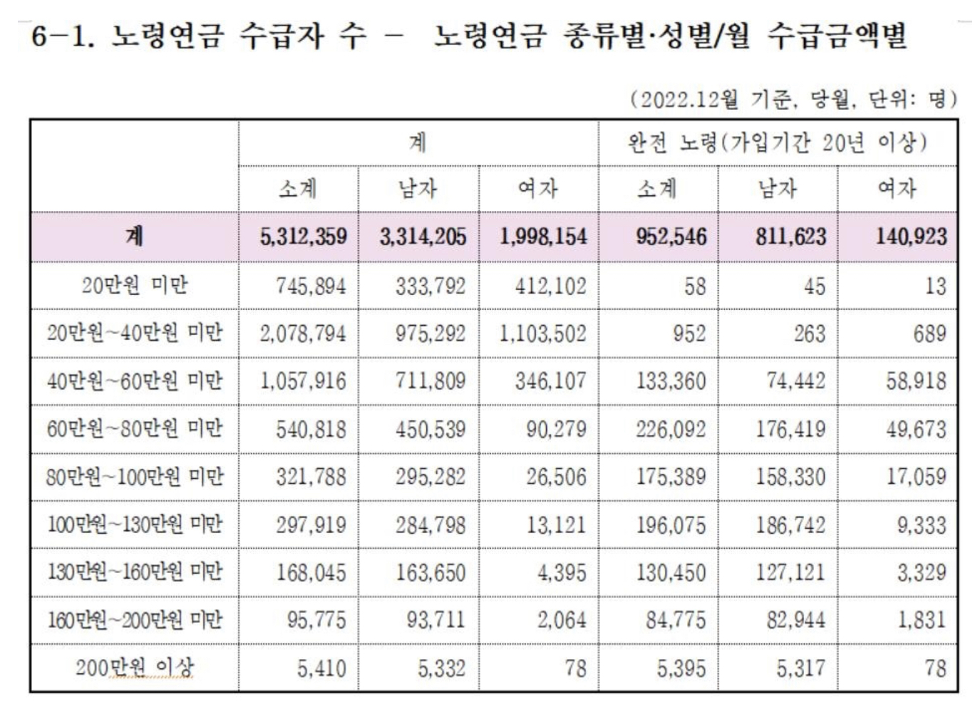 노령연금 수급자는 총 531만 2359명이고, 월평균 수급액은 58만 5112원이다. 수령액 구견별로는 20만원에서 40만원 사이인 사람이 208만 명으로 가장 많다.