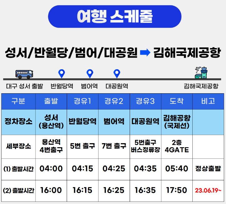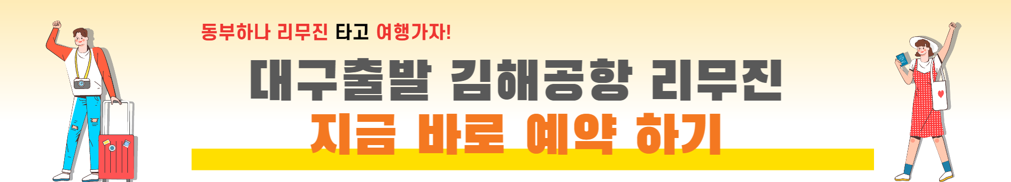 대구에서 출발하는 리무진뿐만 아니라 김해국제공항에서 출발하여 대공원역, 범어역, 반월당역에 도착하는 리무진도 있다. 하루에 2대의 리무진 스케줄이 있으니 여행 시간과 맞다면 동부하나리무진을 이용해서 더욱 편안하게 여행을 마무리하면 좋을 것 같다.