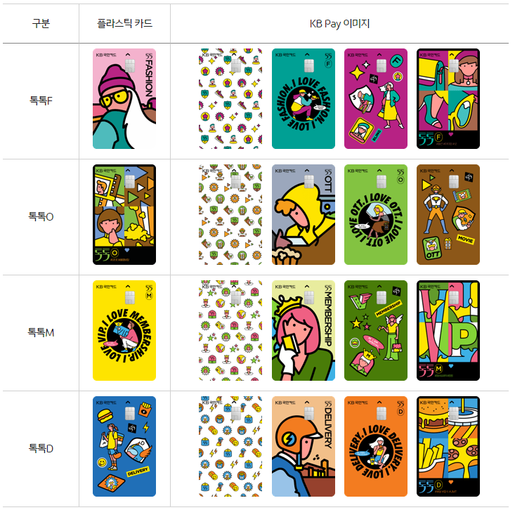 다양한 디자인의 국민카드 톡톡D 카드는 배달앱 결제 시 50%가 할인되는 배달앱 최고의 카드라 할 수 있다. 최대 월 할인한도가 1만 원으로 정해져 있어 배달앱 2만 원 결제 시 가장 큰 혜택을 제공받을 수 있다.