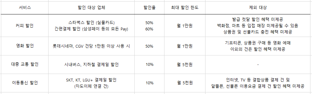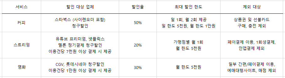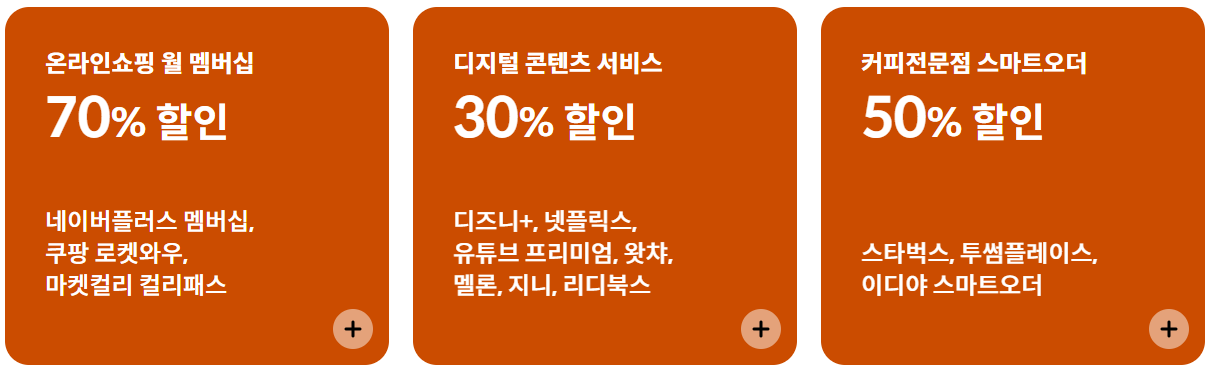 디즈니 플러스, 넷플릭스, 유튜브 프리미엄, 왓챠, 멜론, 지니, 디디북스와 같은 디지털 콘텐츠 서비스 30% 청구할인, 월 5천 원 한도 내에서 이용가능하다.
