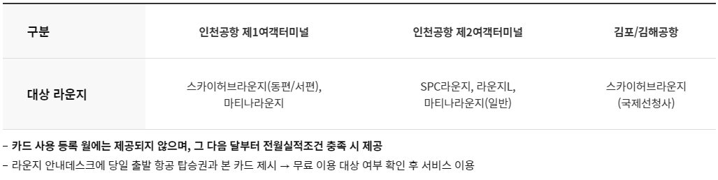 국제공항 라운지 연 1회 무료 이용을 제공한다.