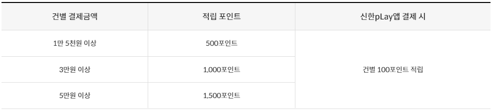 신한 pLay 앱을 통한 결제 시 건당 100포인트 추가 적립된다. 예를 들어 '배달의 민족' 앱에서 3만 원 결제 시 1,000포인트 적립 + 신한 pLay 결제 100포인트 적립. 총 1,100포인트가 적립된다. 최대 적립금은 1,600 포인트이다. 단, 결제 시 '네이버 파이낸셜' 가맹점으로 결제되는 경우 추가 적립 서비스 적용 제외되며, 기본 적립 서비스(잔돈적립)만 적용된다.