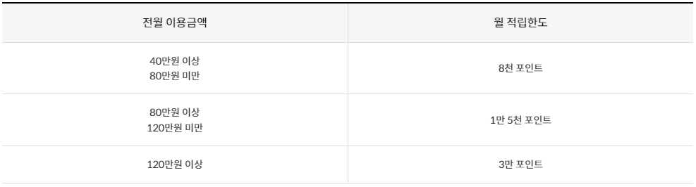 또한 서비스 적용 거래 기준이 1일 1회/월 3회 제공이며, 주유소, 관리비, 통신요금, 의약품 전용몰(도매몰), 제약회사 업종 등은 기본 적립 서비스에서 제외된다. 제외되는 항목을 확인하여 손해 보는 일이 없도록 하자.