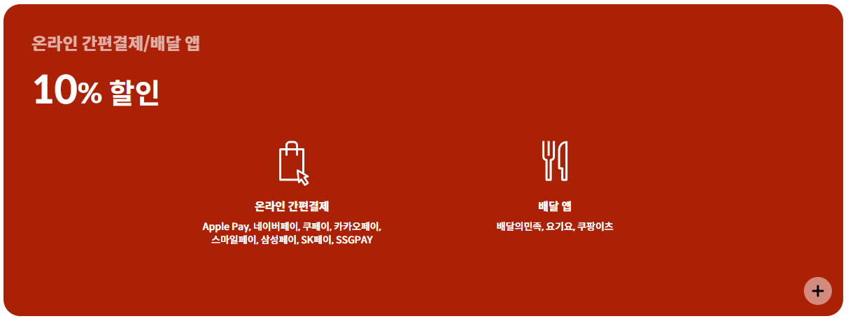 이 외에도 온라인 간편 결제 할인, 편의점 할인, 대중교통 할인혜택이 있다. 단, 온라인 간편 결제 시에는 국내 온라인가맹점 결제만 적용되며 오프라인매장 결제는 적용되지 않는다.