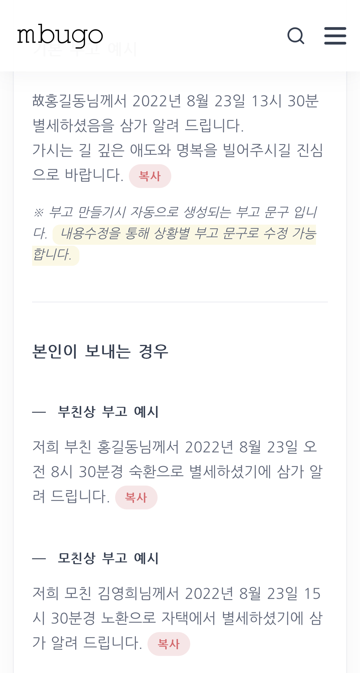 소중한 사람들을 잃은 힘든 상황에서 꼭 필요한 서비스, 무료 부고 안내문 작성 서비스. 어떻게 시작해야 할지 모를 때에도 친절하고 자세한 안내문으로 사용하기 편리했던 sbugo, mbugo에서 도움 받으시면 좋을 것 같아요.