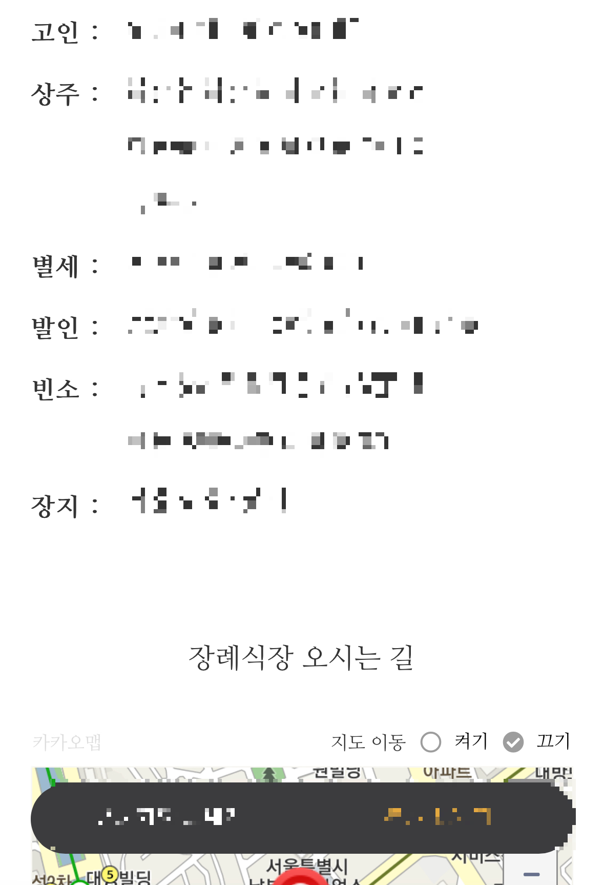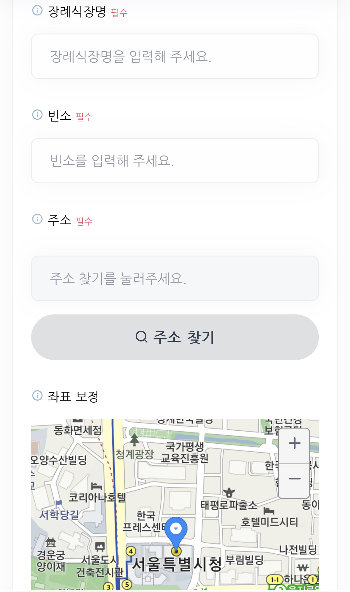 그다음으로는 장례식장 정보를 입력해요. 지도에서 표시될 좌표 정보도 함께 나오니 부고 문자를 받는 분들도 보기가 편할 것 같았어요.