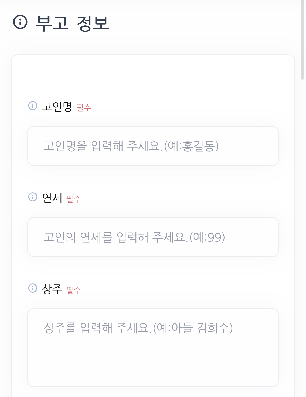그다음으로 고인의 정보를 입력합니다. 상주의 경우에는 여러 명을 입력할 수도 있으며 남자를 보통 먼저 적어요. 연세는 만 나이가 아닌 실제 나이를 적으면 돼요.