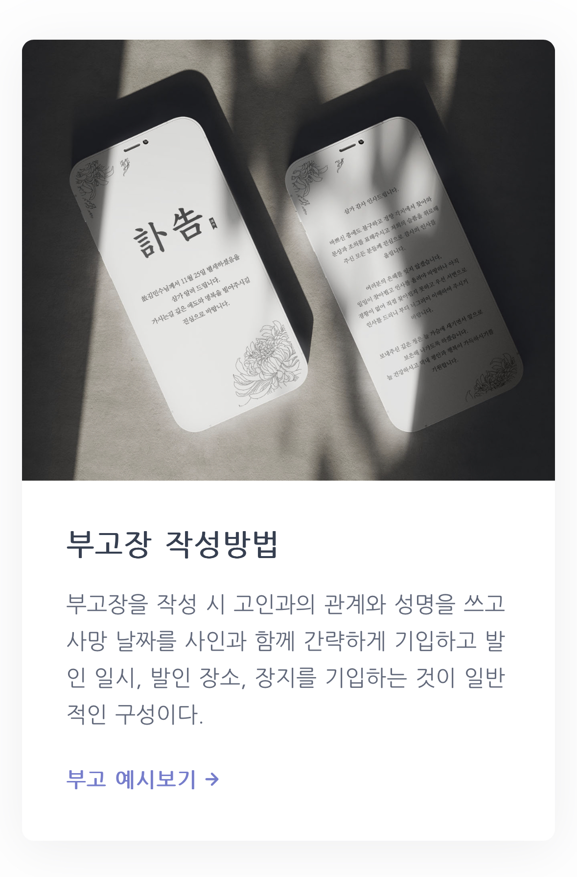 부고장 작성방법에 대해서도 안내되어 있어서 처음이라 어떻게 해야 할지 모르는 상황에서도 유용했어요. 다양한 형태의 양식들이 있어서 어느 상황에서든 간편하지만 예의와 격식을 차린 부고 문자를 작성할 수 있어요.