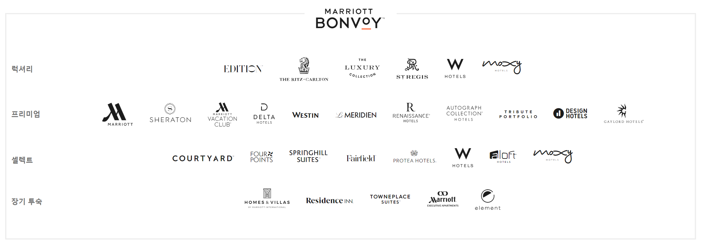 메리어트 본보이 호텔은 4개의 카테고리로 분류됩니다. 럭셔리 라인으로는 에디션, 더리츠 칼튼, 더 럭셔리 컬렉션 등이 있습니다. 에디션의 경우 대표적으로 뉴욕 맨해튼에 위치해 있고, 더 럭셔리 컬렉션은 조선 팰리스 서울 강남, 럭셔리 컬렉션 호텔이 대표적입니다.