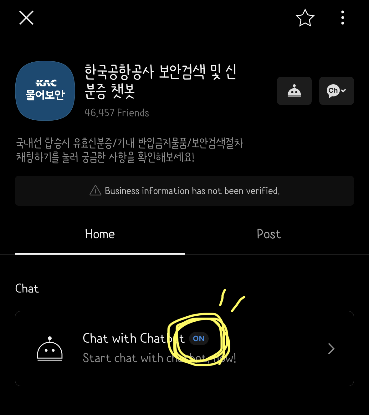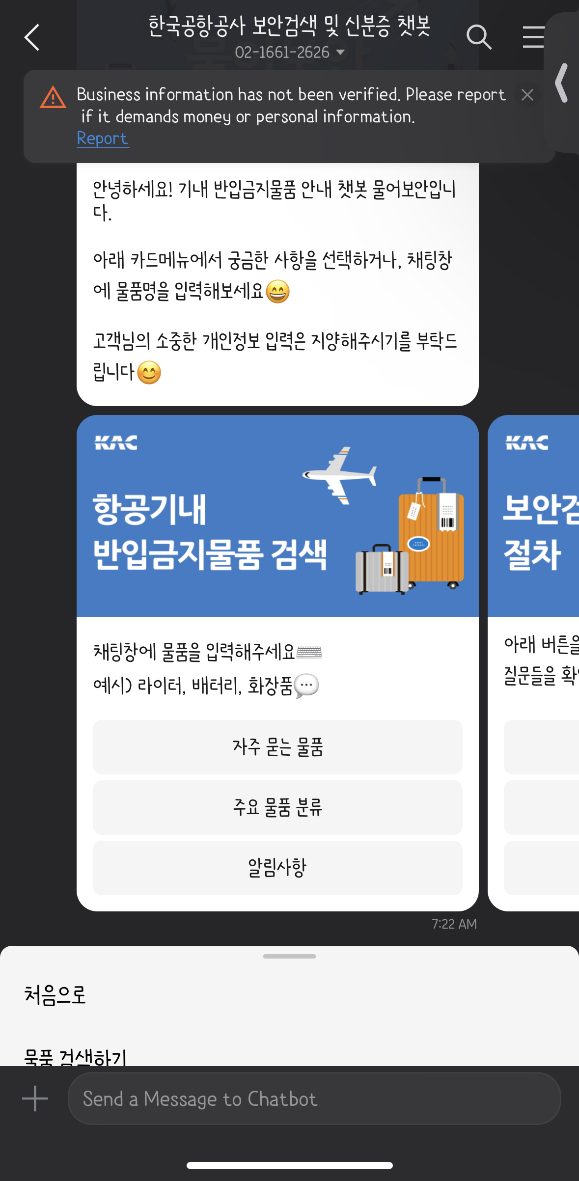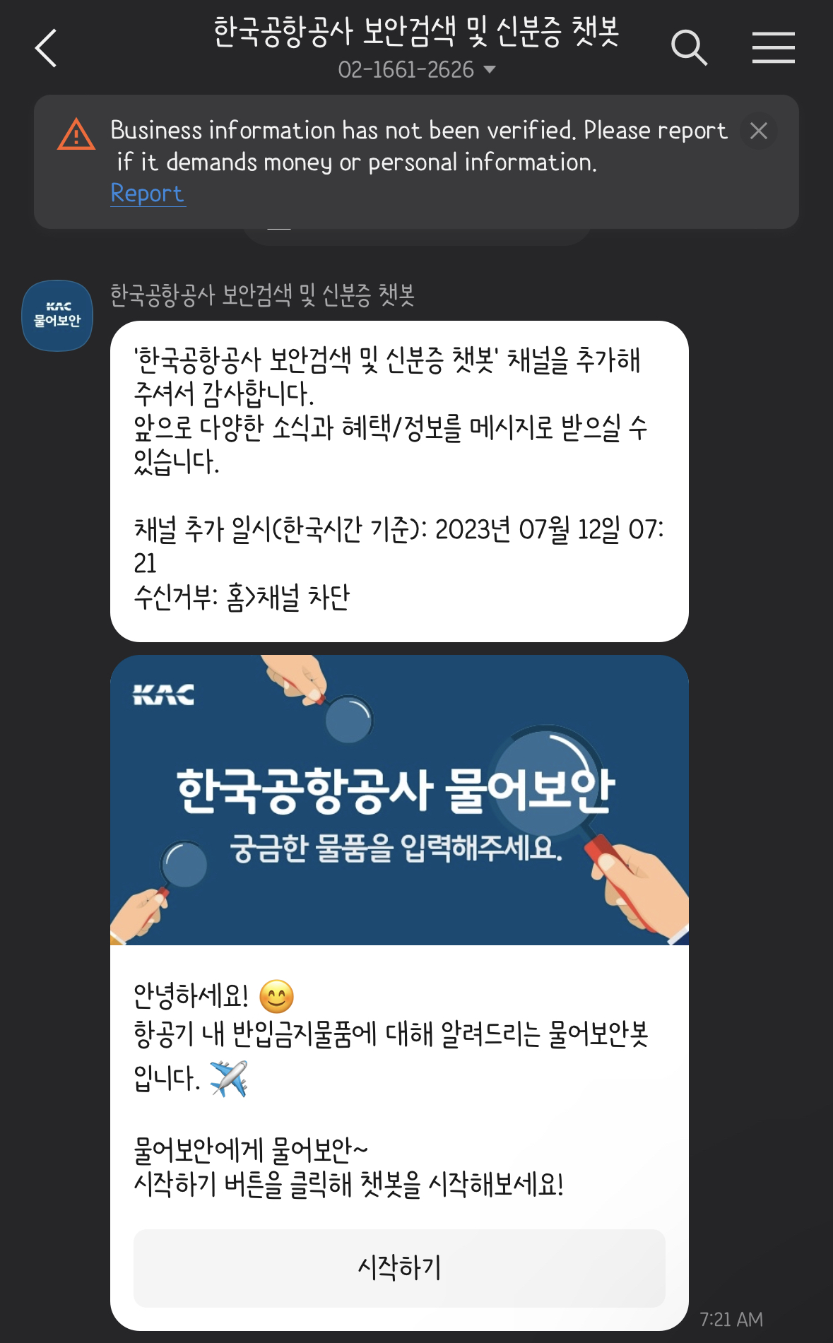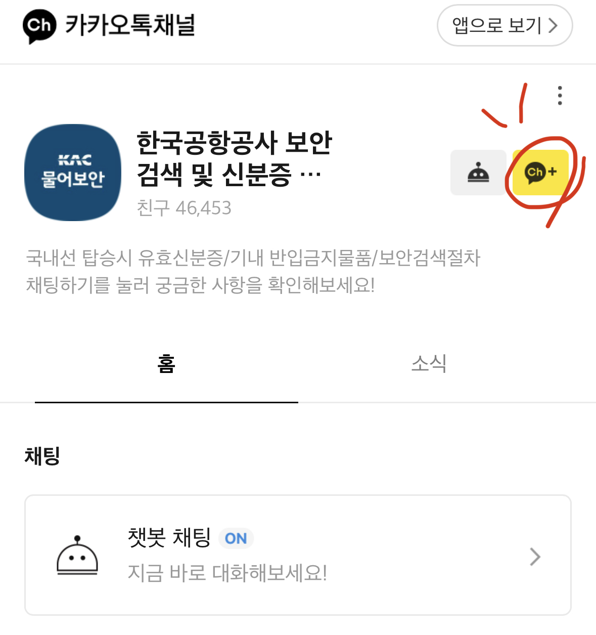 한국공항공사 보안검색 및 신분증 챗봇 카카오채널을 추가버튼 클릭하기!