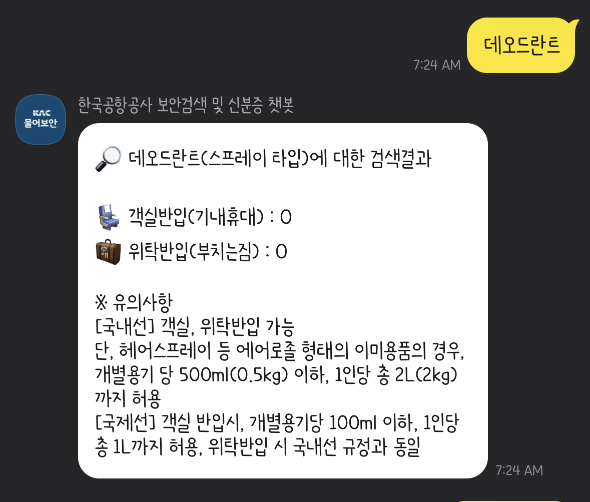 간단하게 품목만 작성을 합니다. 누가 봐도 기내 반입이 될 것 같지 않은 '면도칼'을 물어보면 객실반입 X, 부치는 짐인 위탁반입은 O 가능하다고 안내가 되네요. 데오드란트는 객실반입, 부치는 짐 모두 O 가능합니다. 단, 헤어스프레이 등 에어로졸 형태는 개별용기 당 500ml 이하, 1인당 총 2L까지 허용된다고 친절하게 부가 설명도 해줍니다.