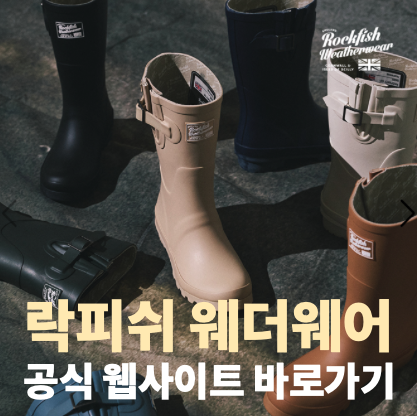 헌터에 비해 낮은 가격대로 많은 사람들에게 사랑을 받고 있는 락피쉬 레인부츠. 락피쉬 웨더웨어는 영국 브랜드로 오리지널 브리티시 감성과 클래식함에 영국 특유의 기후를 고려한 기능성까지 가지고 있다. 숙련된 장인이 15가지의 고무원단을 이어 붙여 만든 핸드메이드 레인부츠이다. 천연고무 49.6% 가 함유되어 있어 얇지만 탄성이 좋고 변형이 적다. 그만큼 무겁지 않고 밸런스를 잘 맞추었다.
