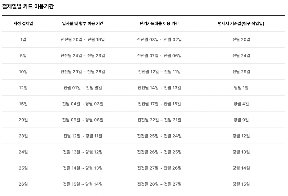 카드 이용 기간은 개인카드에만 적용이 되는 부분이며 지정 결제일이 휴일인 경우는 다음날로 결제되도록 설정되어 있다. 휴일 및 업무 사정에 의해 변경될 수 있는 점을 참고하면 좋을 것 같다.