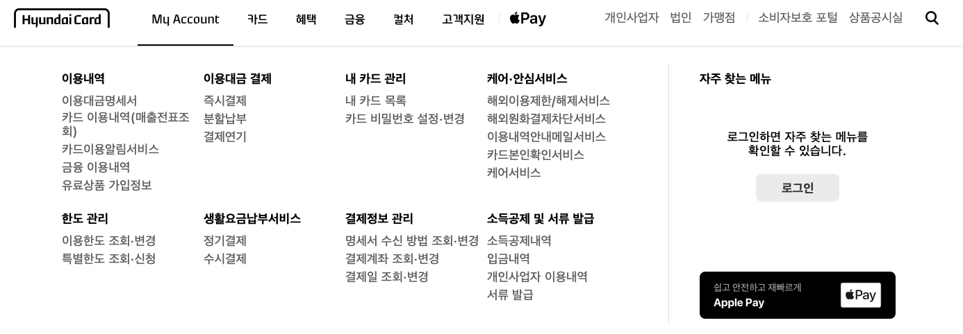 대부분은 월급날 다음날을 카드 결제일로 설정하는 경우가 많다. 하지만 카드 결제일에 따라서 이용기간이 달라져 계획적인 소비를 하기에는 무리가 있다. 현대카드의 경우 전월 01 ~ 전월 말일로 이용기간이 정해져 있는 결제일은 12일이다. 각 카드사마다 결제일에 따른 이용기간이 다르기 때문에 카드사 별로 확인해야 하는 번거로움이 있다.