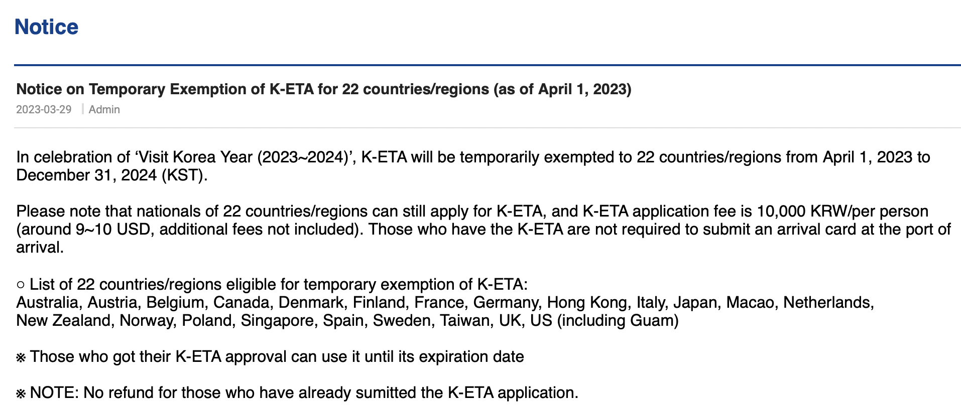 - List of 22 countries/regions eligible for temporary exemption of K-ETA: Aurstralia, Austria, Belguim, Canada, Denmark, Finland, Frnace, Germany, Hong Kong, Italy, Japan, Macao, Netherlands, New Zealnad, Norway, Polan, Singapore, Spain, Sweden, Taiwan, UK, US (including Guam)
