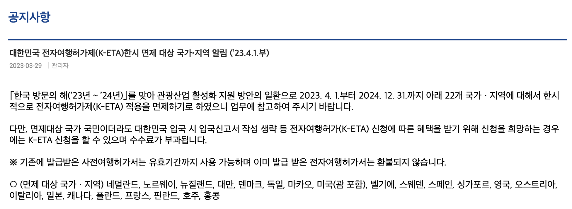 Notice on Temporary Exemption of K-ETA for 22 countries/regions