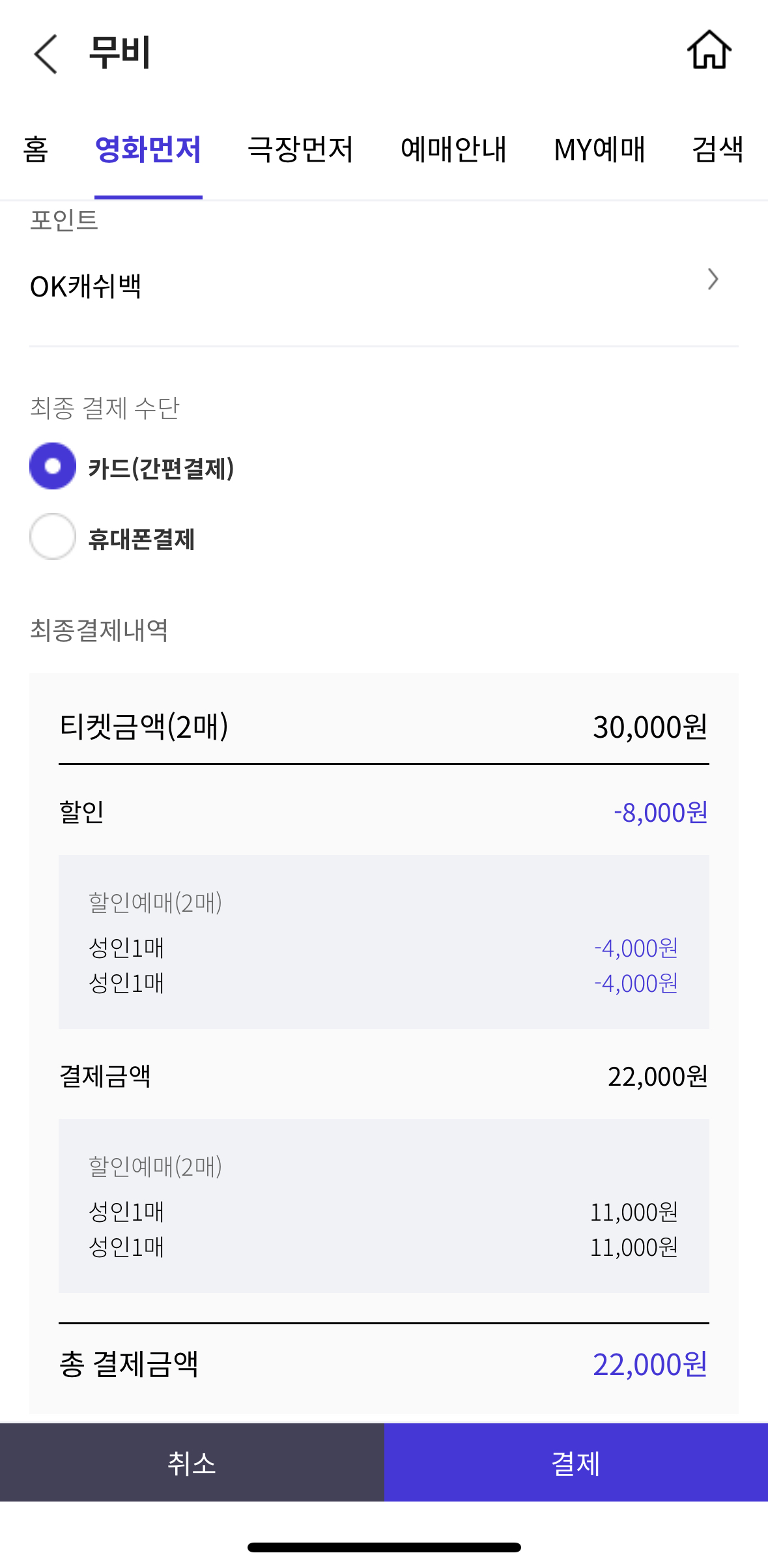 무비 페이지에 들어와서 원하는 영화와 영화관을 선택합니다.